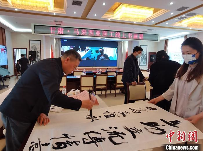 在主會場的蘭州,甘肅書畫家現場圍繞中馬友誼進行書法繪畫創(chuàng)作,并通過網絡向馬來西亞書畫家講解展示。
