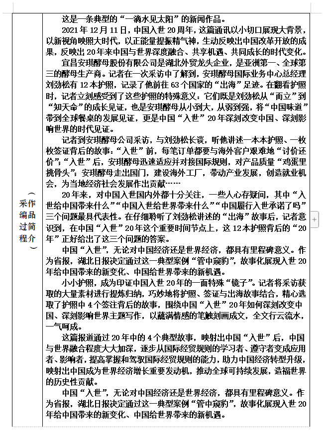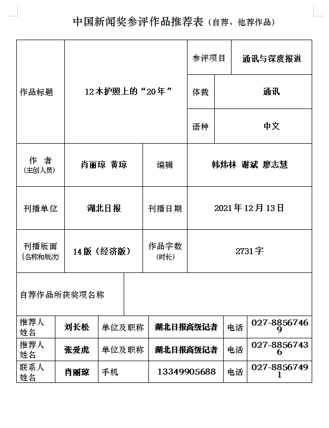 《湖北日報》2021年12月13日的通訊《12本護照上的“20年”》,擬參加湖南大學新聞與傳播學院報送參評第三十二屆中國新聞獎作品初評,現予以公示。公示期為2022年5月23日至2022年5月27日,如有異議,可以通過電話、傳真或電子郵件等方式,于5月25日17時前反映,逾期不再受理。
