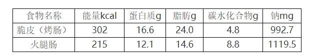 火腿腸、脆皮(烤)腸食物營養(yǎng)成分表,摘自:楊月欣,《中國食物成分表2004第二冊》