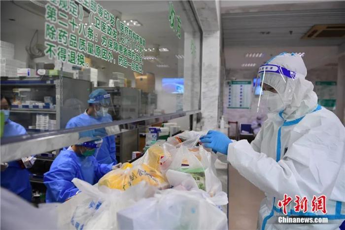 上海市虹口區涼城新村街道廣靈二路居委會社區下沉干部疫情期間為居民取藥。中新社記者 田雨昊 攝
