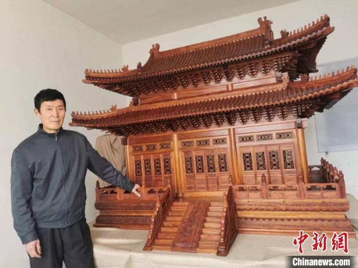 中新網吉林6月8日電 (記者 石洪宇)62歲的胡平是吉林省吉林市的一位木匠。最近,他憑高超的技藝完成了一個清代建筑模型。