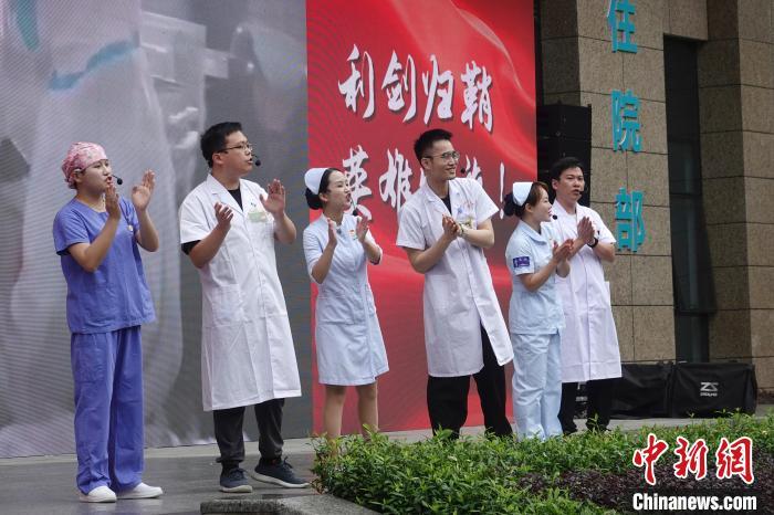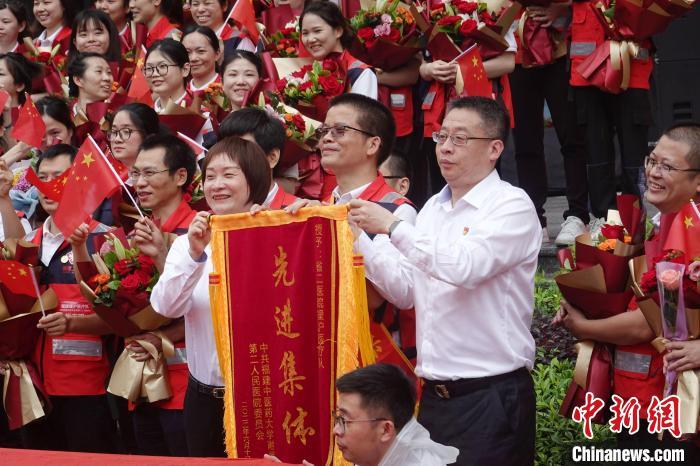 圖為醫院職工獻歌歡迎隊員返院。 福建省二院供圖