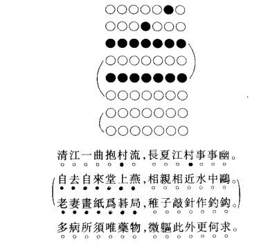 所謂“二字貫串”與“三字棟梁”,《木天禁語》并沒有給出解說。按圖所標(biāo)為兩“村”字,應(yīng)該有誤。一般理解當(dāng)為“江”“村”二字。“三字棟梁”,按明人梁橋《冰川詩式》(卷七)的說法,是“妻”“紙”“棋”,顯然沒有意義。參考有關(guān)詩例,分析這首詩,可以認(rèn)為是“事事幽”三字。又古人“事”“物”字義往往互借,根據(jù)該詩中間兩聯(lián)內(nèi)容,“事事”可以理解為“事事物物”。《冰川詩式》對“二字貫串”的解釋是:“起聯(lián)立二字,中兩聯(lián)分應(yīng)之,或每聯(lián)各句應(yīng)之。結(jié)聯(lián)脫言,亦要含意。”這個“應(yīng)”講的就是“貫串”,即血脈針線。借鑒古人之說,發(fā)揮我們的智慧,可以對這首詩作很好的品鑒。第一聯(lián)上下句分別點出“江”和“村”兩個關(guān)鍵字(也是扣題),“事事幽”三字再作分解,分成“事事(物物)”與“幽”。詩題《江村》,寫“江”寫“村”,寫江上之事(物)、村中之事(物),要寫的就是一個“幽”,“幽”是全詩結(jié)穴,一詩之神,反反復(fù)復(fù),橫說豎說,就是要寫足“幽”。寫好“幽”,詩便成功。看中間兩聯(lián),都是上句“村”下句“江”。假如換一個視角,用“事”和“物”兩字看,則是頷聯(lián)寫“物”頸聯(lián)寫“事”。如此就十分清楚:“自去自來堂上燕”,村中之物“幽”;“相親相近水中鷗”,江上之物“幽”。“老妻畫紙為棋局”,村中之事“幽”;“稚子敲針作釣鉤”,江上之事“幽”。結(jié)聯(lián)呢?《冰川詩式》說“結(jié)聯(lián)脫言,亦要含意”,如何理解?結(jié)聯(lián)與“江”“村”“事”“物”都已無關(guān),從字面看,也無關(guān)乎“幽”,此即所謂“脫言”:擺脫開來,卻說別意。那是不是與上文斷裂了?當(dāng)然不是,“亦要含意”就是要歸到詩旨上來。就《江村》說,怎么“含意”?就是含“幽”之意。按首聯(lián)所言:我之所以“幽”,是由于“清江一曲抱村流”,居地江水環(huán)繞,與世隔絕。但這不可能是“幽”的真正原因。真正原因,是結(jié)聯(lián)的最后三字“更何求”,我已無求于世,人也無求于我。無欲無求,無思無為,身閑心靜,如此才“事事幽”。這才是“幽”的真正原因。結(jié)聯(lián)揭示詩旨,是全詩真精神所在。到此,我們不能不佩服千古經(jīng)典名作之詩藝高超。