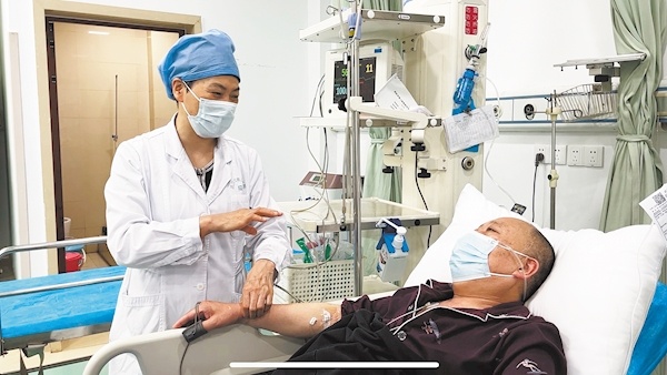 6月1日上午10時許,武漢市第三醫院光谷院區急診室,省黨代表、該院第三黨總支書記、急診科主任付守芝拿起聽診器,為病床上的鄒大爺檢查康復狀況。