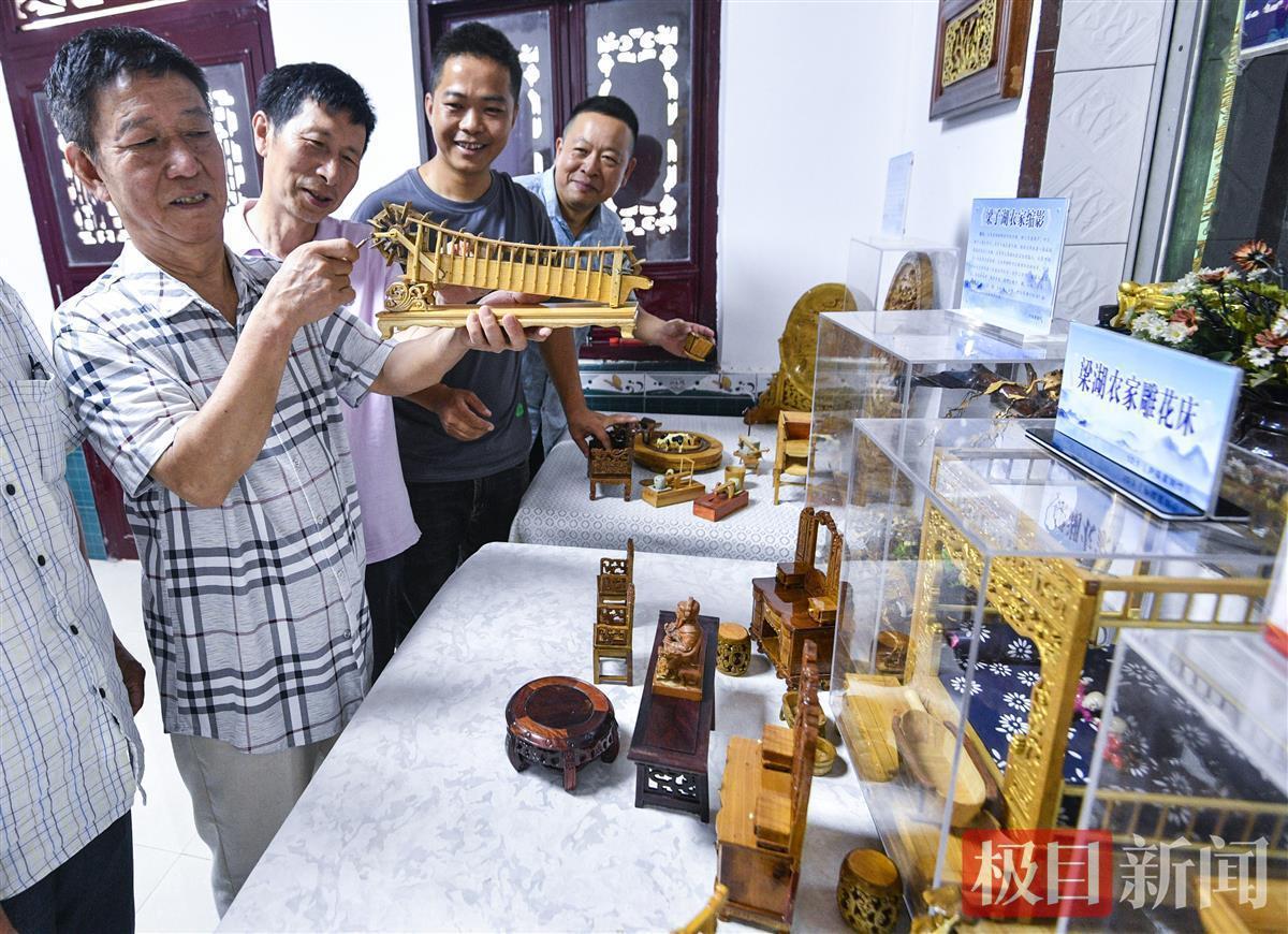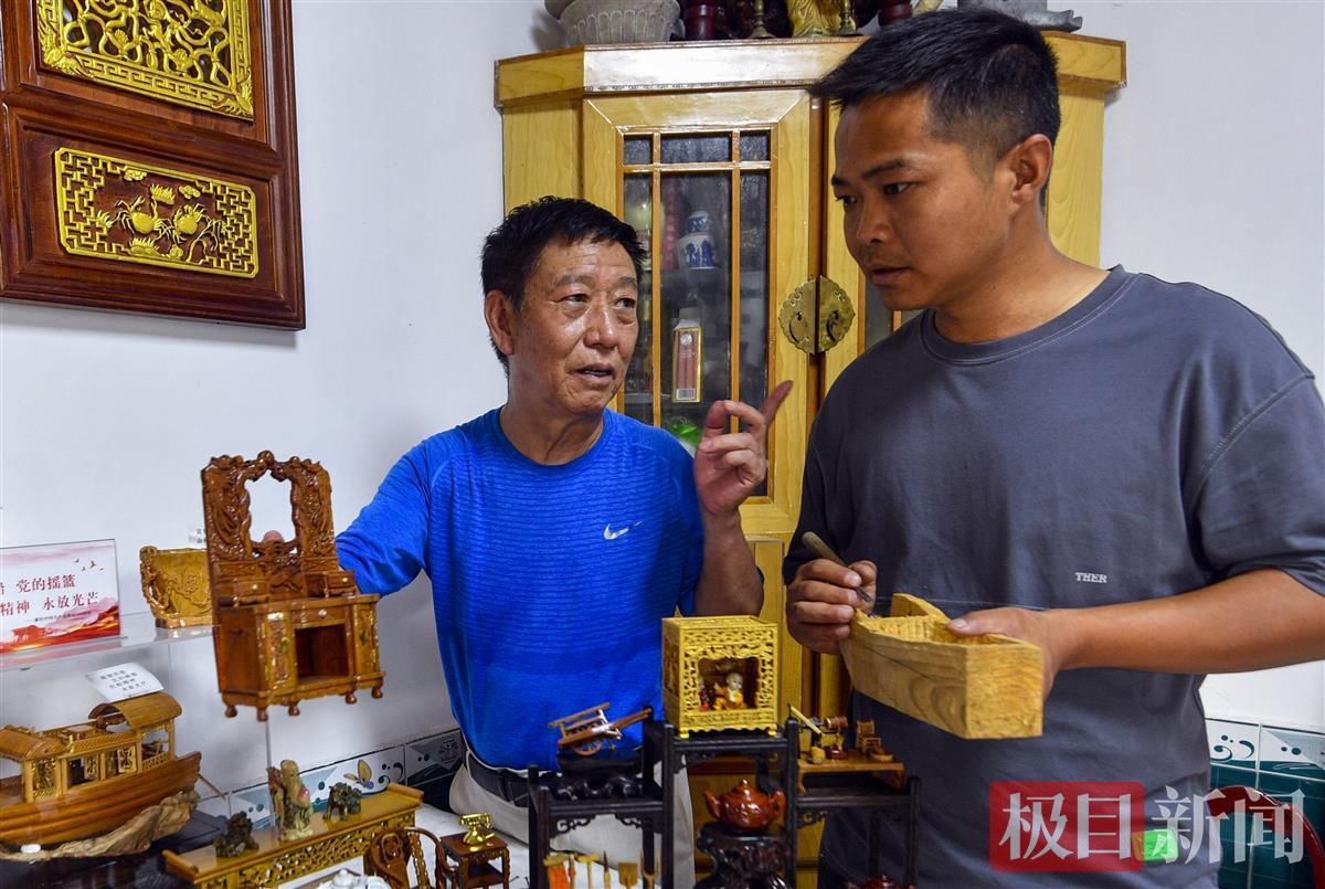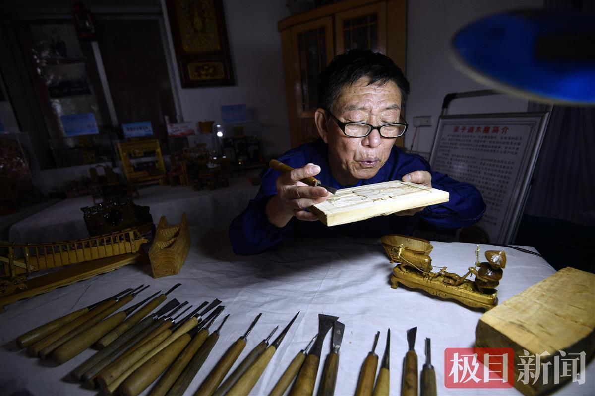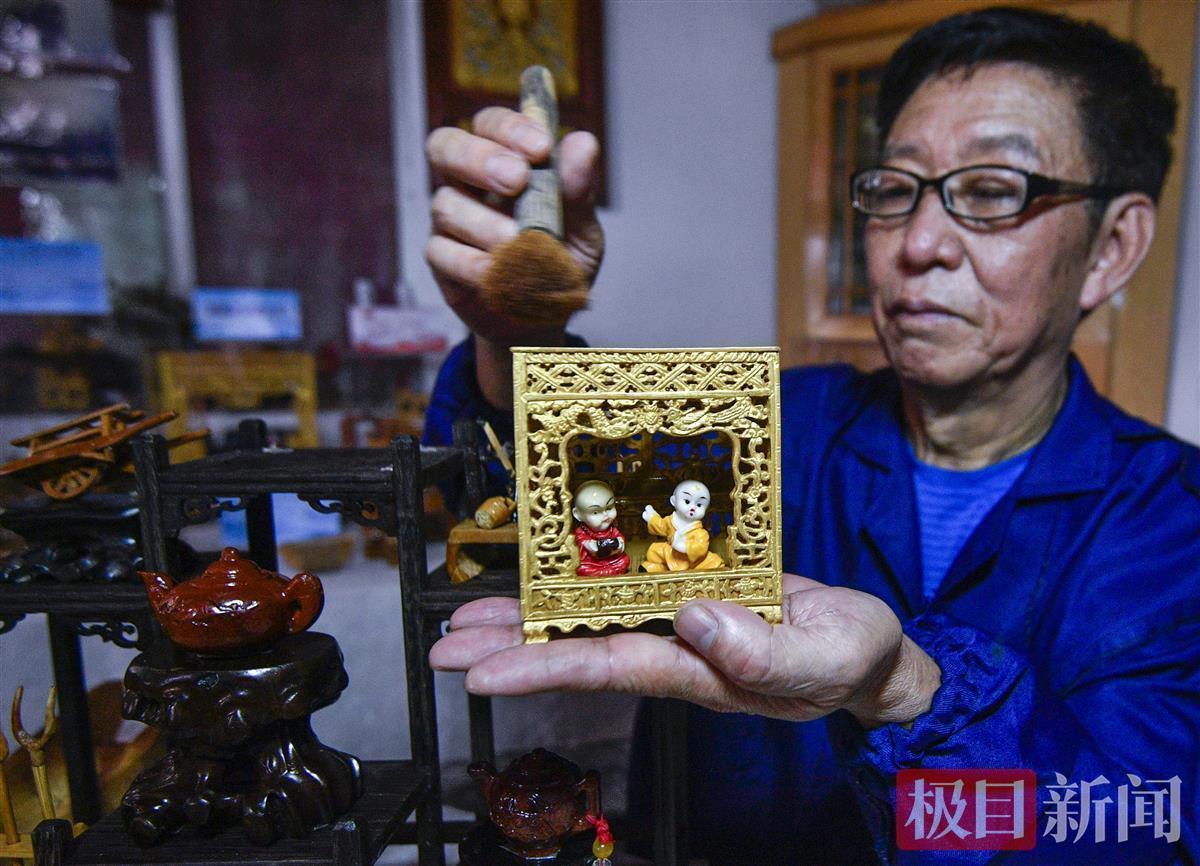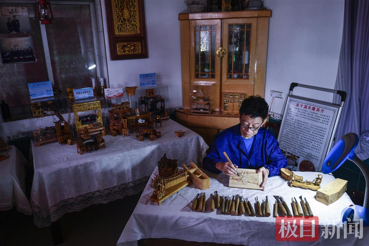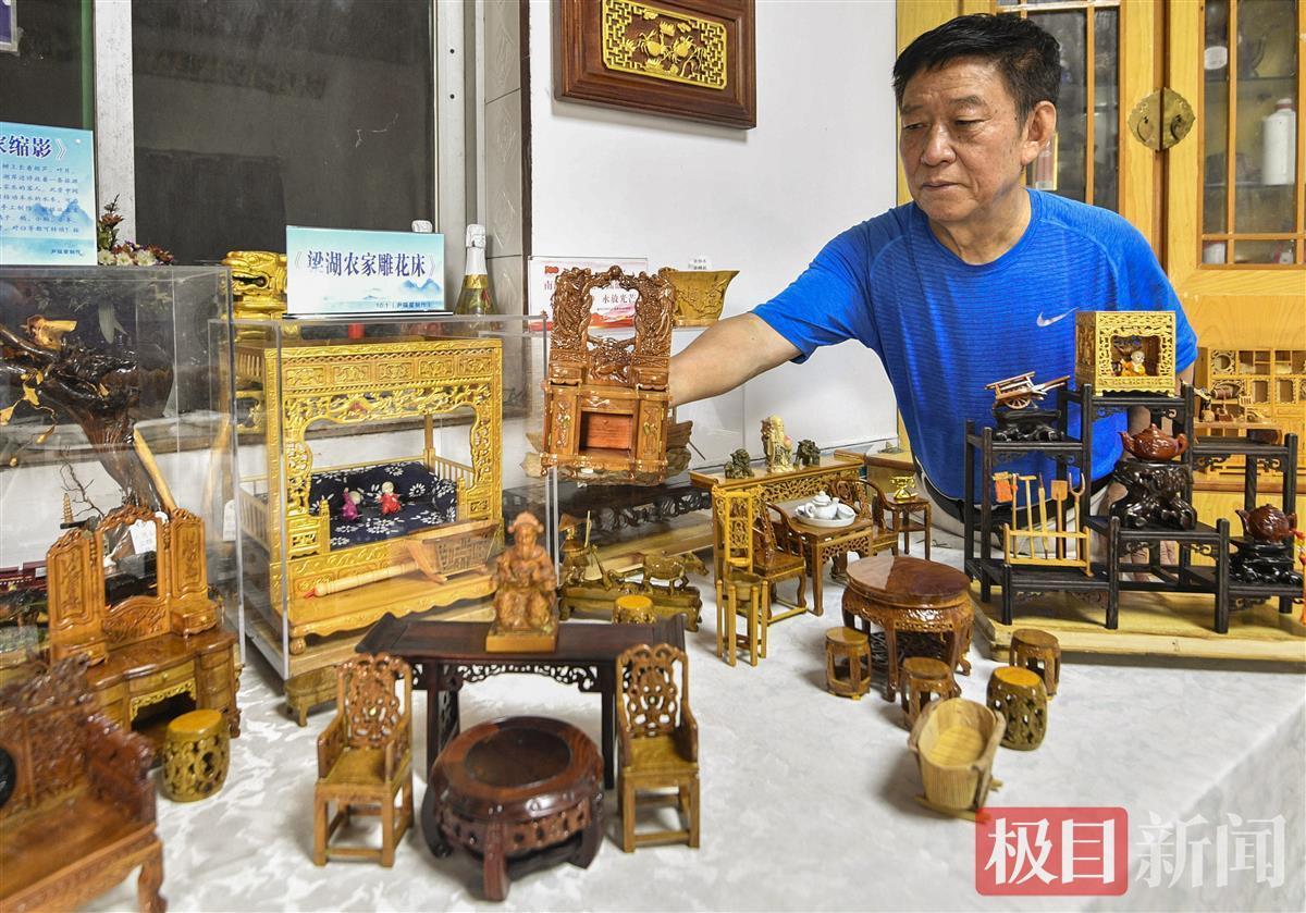 近日,極目新聞記者走進尹福星家里的創作工作室,看到一張桌子上擺滿了各種木雕作品。有農家雕花床、梳妝臺、茶幾、凳子、水車、烏篷船,還有農民牽著牛兒犁地的場景……一件件作品小巧玲瓏,栩栩如生,組成了一個微縮版的木雕世界。