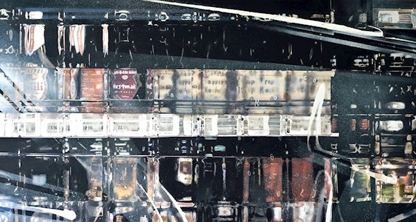 我琢磨了很久。有一天逛超市,我無意中看到洋酒瓶在燈光下有一種特別的排列組合,特別有形式感和節奏感。我把這個場景記錄下來,回到工作室后就開始畫小稿,嘗試運用新的技術和材料來畫這個酒瓶系列。我甚至嘗試了不常規的技術和方法,在構圖、選材和色彩的搭配上都做了一些主觀的嘗試和變化。