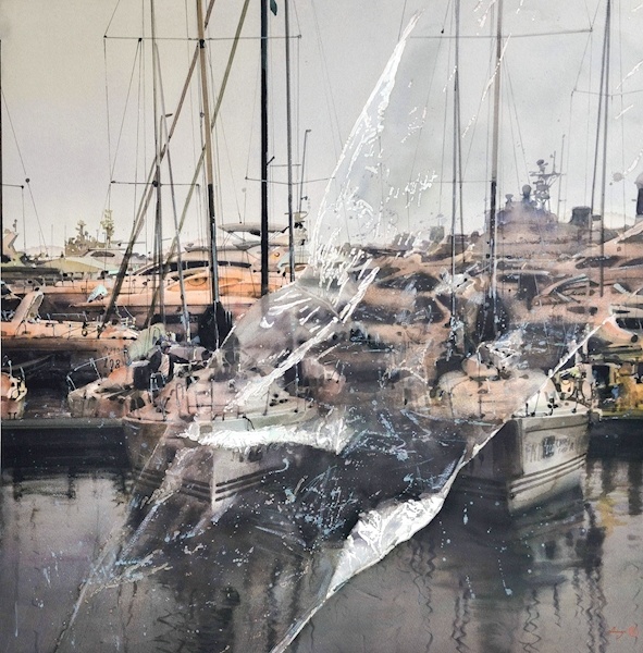 船系列是我的主打。很多年前我去過福建、山東的一些沿海城市,對港口碼頭上的各種船留下了深刻的印象。我覺得船和碼頭,都很貼近于水彩,用水彩表現船只,是非常合適的,很能體現船與水的關系,體現水彩的韻味。船系列在全國獲得了一些獎,我還是很喜歡畫船的,包括水、港口、碼頭,以后也將繼續畫下去。