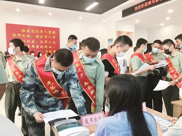 荊門市漳河新區舉行儀式歡迎退役軍人返鄉,并組織專場招聘。荊門市退役軍人事務局供圖