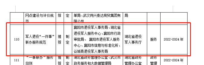與此同時,襄陽市退役軍人事務局同步開展標準規范的起草制訂工作。3月24日參加襄陽市地方標準立項評審會后,專家一致推薦申請湖北省地方標準。經與省標準化院、省退役軍人事務廳進一步溝通對接,由襄陽市退役軍人事務局主筆起草,湖北省退役軍人事務廳、湖北省退役軍人服務中心、襄陽市行政審批局、襄陽市退役軍人服務中心、襄陽市標準化與質量研究所、谷城縣退役軍人事務局聯合制定的《軍人退役“一件事”聯辦服務規范》,6月9日參加立項評審會,經公示后最終成功立項。