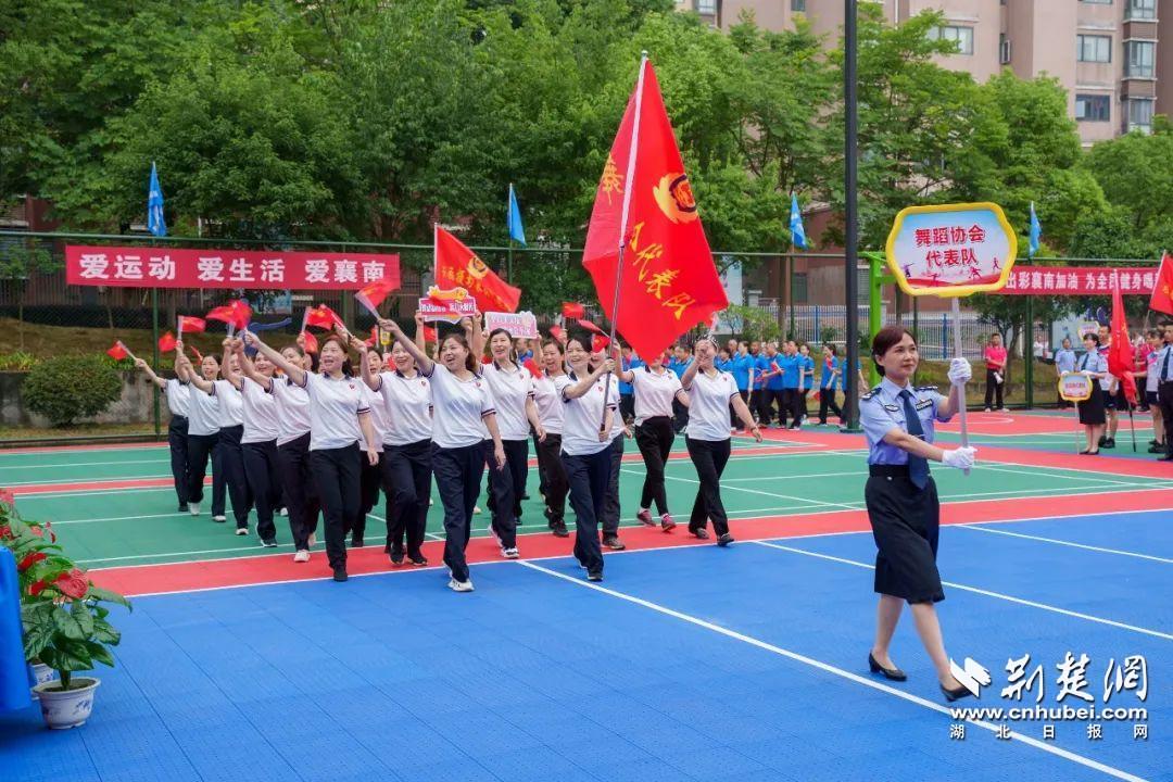 “全體起立,奏唱國歌!”現場所有人員齊唱國歌,并高呼“喜迎二十大 襄南健身行”。