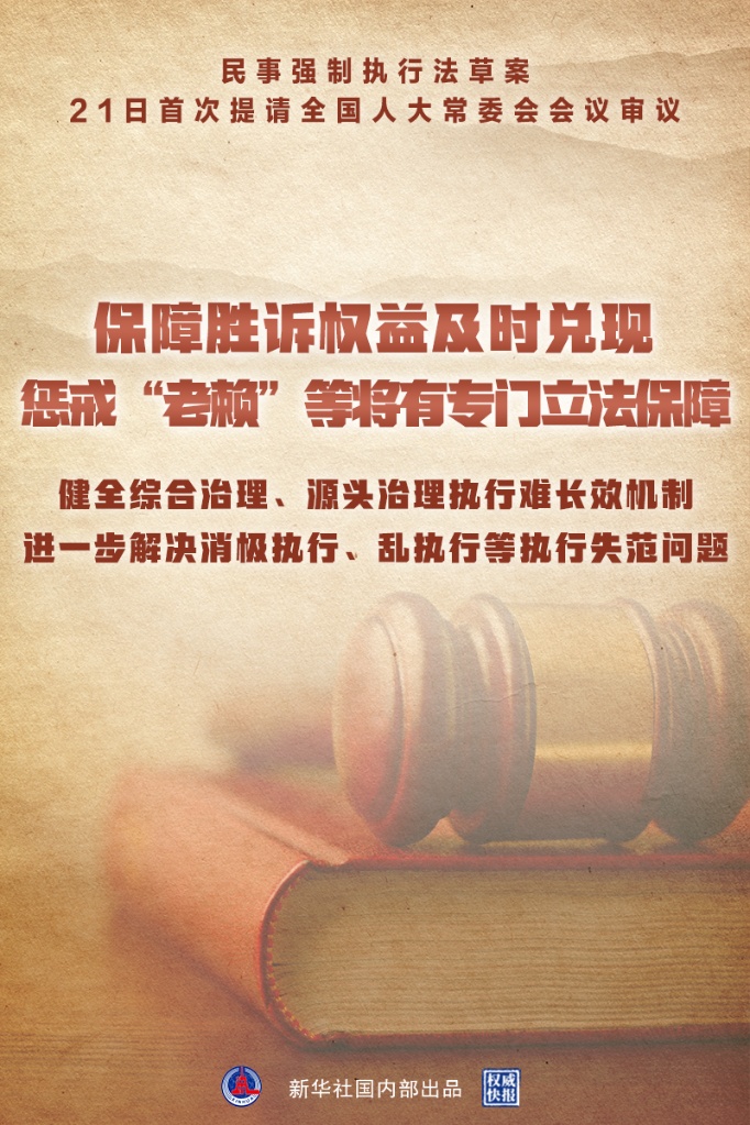新華社北京6月21日電(記者翟翔、齊琪)民事強制執行法草案21日提請十三屆全國人大常委會第三十五次會議初次審議。這是我國首次專門立法保障民事強制執行。