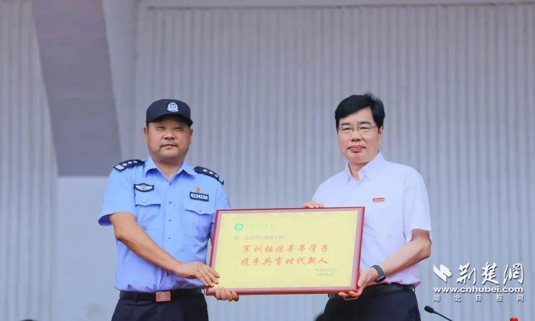 會上,中南民族大學校長李金林向武漢警官職業學院贈送了軍訓紀念牌,以感謝這段時間教官們的辛勤付出。