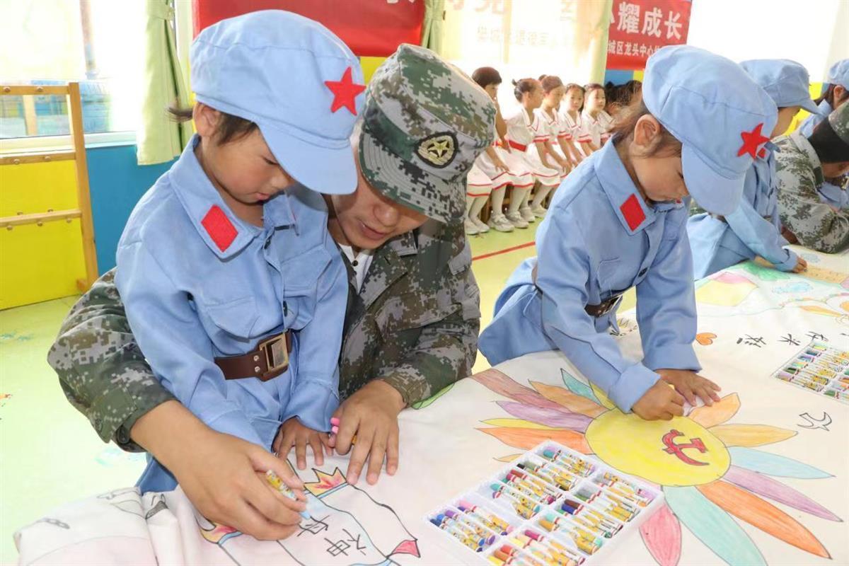 “叔叔,你也教我升國旗吧!”、“叔叔,為什么你疊的被子像是一塊豆腐”、“叔叔,我應該把‘神舟’飛船涂上什么顏色?”在龍頭中心幼兒園,退役軍人志愿者為幼兒示范升旗儀式,教授幼兒整理內務,欣賞幼兒的歌舞表演并和幼兒一起完成繪畫作品《喜迎二十大,童心永向黨》。
