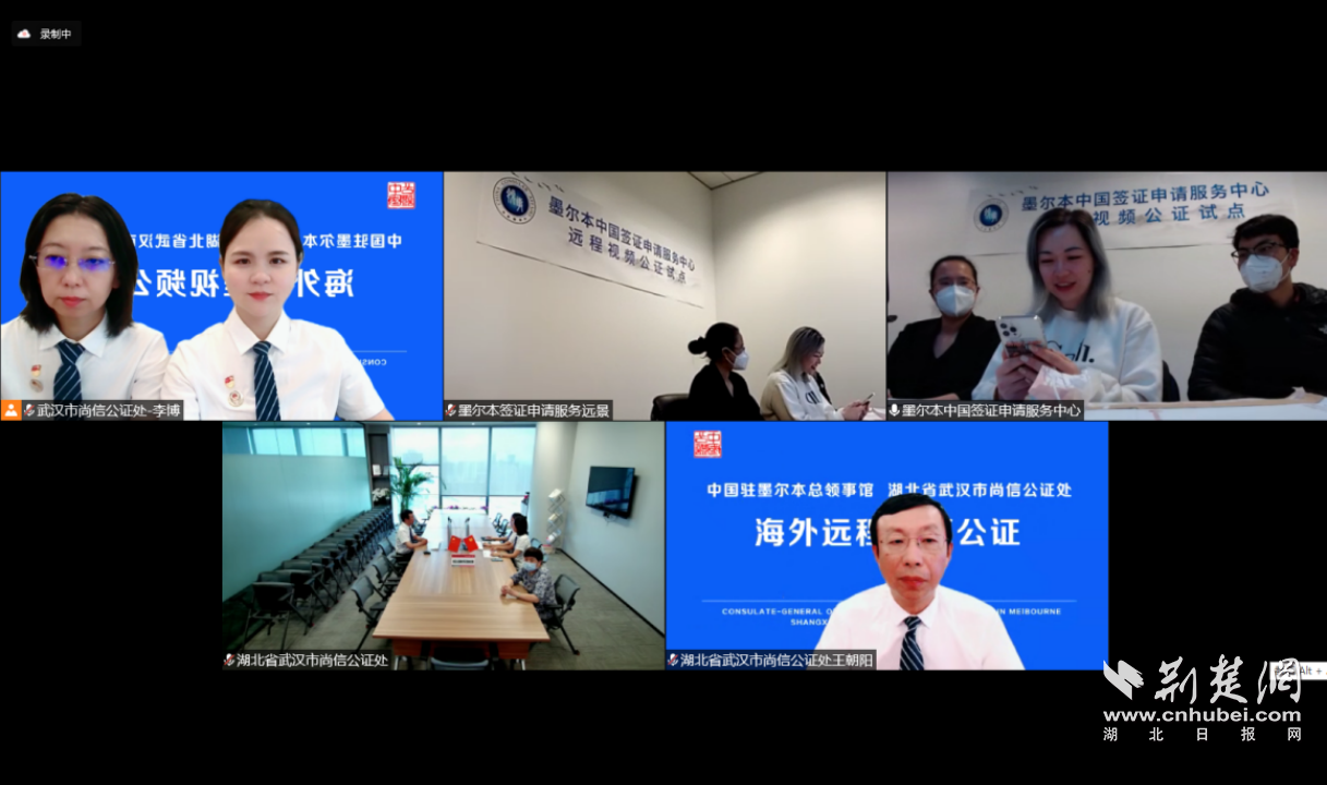 荊楚網(湖北日報網)訊(通訊員 李嘉健、李博)6月24日下午,湖北省武漢市尚信公證處與中華人民共和國駐墨爾本總領事館、墨爾本簽證申請服務中心通過遠程視頻方式,為身處澳大利亞的中國公民李女士辦理了放棄繼承權聲明書公證。這是湖北省首例與中國駐外使領館合作辦理的海外遠程視頻公證。