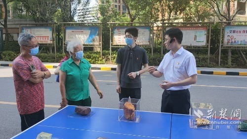 雌黃、黃鐵礦、孔雀石、恐龍蛋······活動(dòng)現(xiàn)場,湖北地質(zhì)工作者將湖北地質(zhì)博物館的展品移到社區(qū),得知消息的居民紛紛前來參觀。