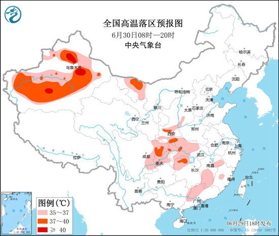預計6月30日白天,新疆北疆盆地和南疆盆地、內蒙古西北部、陜西關中、四川中東部、重慶大部、湖北西部、湖南西北部、江西南部和東北部、廣東北部等地有35~36℃高溫天氣,其中,新疆北疆盆地和南疆盆地、內蒙古西北部、四川東北部等地部分地區最高氣溫37~39℃,局地可達40℃以上。
