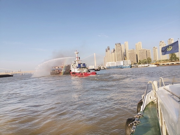 凌晨5時30分,長航公安部門“長公1201”消防艇和武漢消防“漢消1號”消防艇趕至現場,兩條水龍對船舶失火部位精準噴射,兩艘海巡艇負責長江航運安全,引導過往船舶避開事發水域。