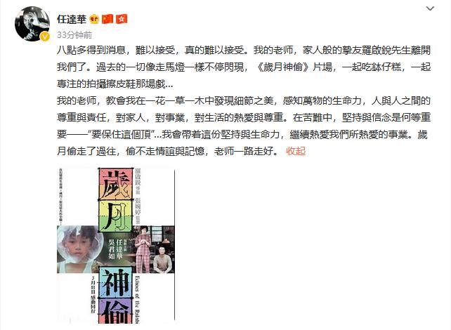 中新網7月3日電 據香港《星島日報》網站報道,香港著名導演羅啟銳辭世,享年69歲。曾出演過羅啟銳導演的影片《歲月神偷》的香港演員任達華在微博證實該消息,并悼念稱:“我的老師,家人般的摯友羅啟銳先生離開我們了。歲月偷走了過往,偷不走情誼與記憶,老師一路走好。”