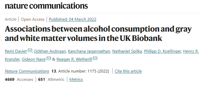2022年3月,美國賓夕法尼亞大學(xué)的研究人員在《自然》(Nature)雜志子刊《自然·通訊》期刊上發(fā)表了一篇題為《酒精消耗量與灰質(zhì)和白質(zhì)體積之間的關(guān)系》的研究。研究發(fā)現(xiàn),即使是適量飲酒,也會讓大腦變小,輕度至中度飲酒與整體腦容量減少有關(guān)。