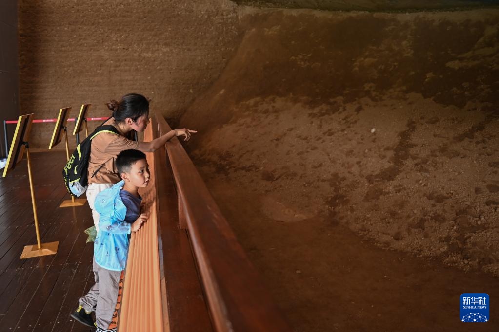 7月6日,游客在良渚古城遺址老虎嶺遺址公園參觀。