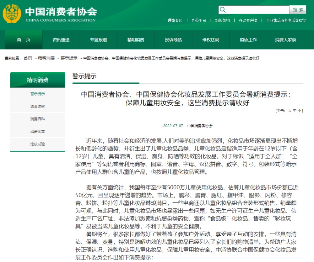 中國消費者協會、中國保健協會化妝品發展工作委員會暑期消費提示:保障兒童用妝安全,這些消費提示請收好