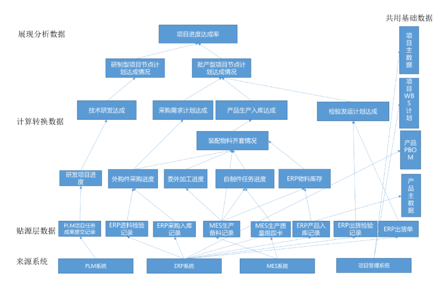 以項(xiàng)目接單交付進(jìn)度分析跟蹤、生產(chǎn)準(zhǔn)備檢查的需求為例。通過(guò)對(duì)項(xiàng)目進(jìn)度達(dá)成分析的需求,從而得知項(xiàng)目計(jì)劃、各子任務(wù)的執(zhí)行進(jìn)度反饋來(lái)源于多個(gè)系統(tǒng)(包括項(xiàng)目管理系統(tǒng)、PLM系統(tǒng)、ERP系統(tǒng)、MES系統(tǒng)、甚至部分線下記錄表等),各系統(tǒng)對(duì)其主要業(yè)務(wù)過(guò)程通過(guò)單據(jù)進(jìn)行分別記錄,如研發(fā)任務(wù)下發(fā)與成果物提交入庫(kù)、采購(gòu)合同、采購(gòu)收貨、采購(gòu)入庫(kù)、生產(chǎn)領(lǐng)料、工序報(bào)工等,將這些數(shù)據(jù)按照項(xiàng)目任務(wù)及產(chǎn)品結(jié)構(gòu)層級(jí)分解,就可以構(gòu)成整體的數(shù)據(jù)任務(wù)進(jìn)度的數(shù)據(jù)鏈條,從而可以計(jì)算得到項(xiàng)目的進(jìn)展情況。
