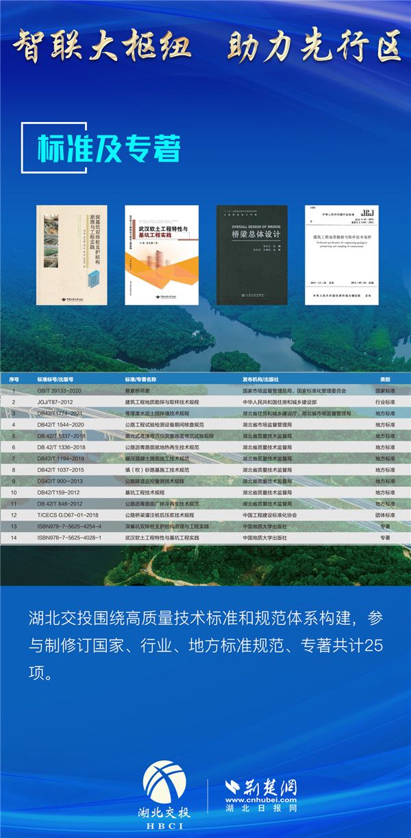 同時,湖北交投還承擔科技創新項目200余項,取得各類科研成果800多項,獲得省部級以上獎勵140余項,發布國家標準、行業標準、地方標準及專著25個。這些原創的“黑科技”在重大交通項目的成功應用,為我省智慧交通建設立下了汗馬功勞。