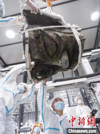 他回憶道,大面具露頭時,面部朝下、凹面向上,很多象牙疊壓在上面,右邊耳朵也已斷裂,再加之埋藏時間太長,對其埋在土里部分的銹蝕程度無法清楚掌握。“凹面內還有泥土和器物,提取時整體重量接近200斤,必須依靠機械吊裝。”
