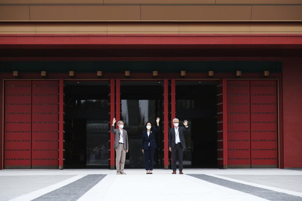 2022年5月10日,在香港故宮文化博物館,西九文化區管理局行政總裁馮程淑儀(中)、香港故宮文化博物館館長吳志華(右)和香港故宮文化博物館設計師嚴迅奇(左)在揮手致意。新華社記者 王申 攝