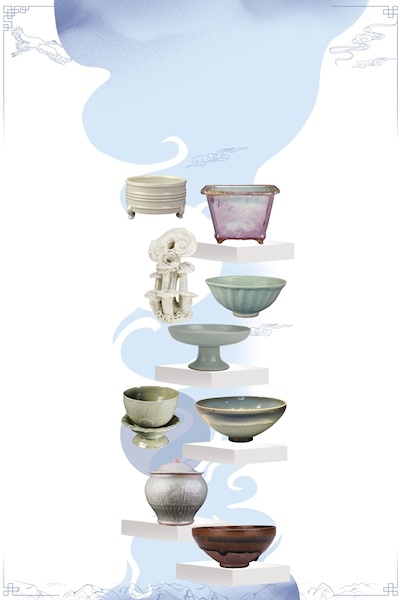定窯白釉弦紋爐 宋代鈞窯玫瑰紫釉長方花盆 清代仿哥窯靈芝花插 宋代龍泉窯菊瓣紋瓷碗 清代天青釉高足盤 五代秘色瓷蓮花碗 宋代鈞釉碗 元代龍泉窯青釉獅鈕瓷蓋罐 宋代建窯兔毫盞