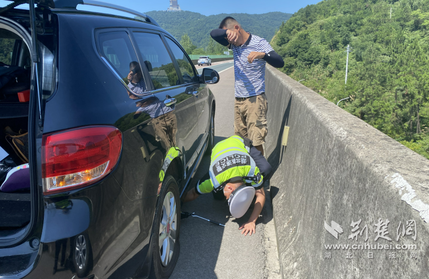 11時剛過,汪俊接到支隊指揮中心電話:福銀高速福銀向武當山出口附近有一輛轎車撞到護欄。趕到現場后,汪俊發現轎車左前輪爆胎,導致車輛失控撞上了中央隔離帶護欄,車輛停在應急車道內,現場剛好處于彎道,二次事故風險極大。