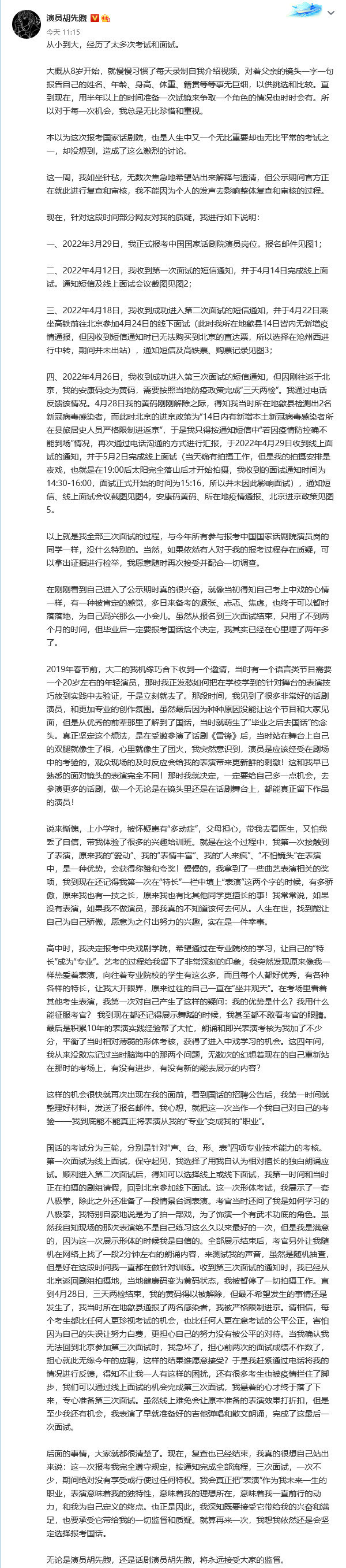 中新網北京7月17日電 演員胡先煦17日就報考國家話劇院一事發布聲明稱,本次報考完全遵守規定,按通知完成全部流程,三次面試一次不少,期間絕對沒有享受或行使過任何特權。