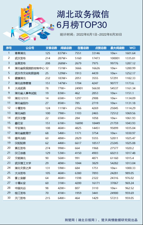 7月19日,荊楚網(湖北日報網)、楚天輿情數據研究院制作發布了6月湖北政務微信排行榜。本期榜單前三名入榜賬號仍然是“青春湖北”“武漢發布”和“宜昌發布”。變化的是,“武漢發布”超越“宜昌發布”,從第三名升至第二名。此外,6月教育領域賬號WCI指數上漲明顯,其中湖北省招辦、湖北省教育廳、武漢理工大增幅較大,湖北省招辦增幅最大。