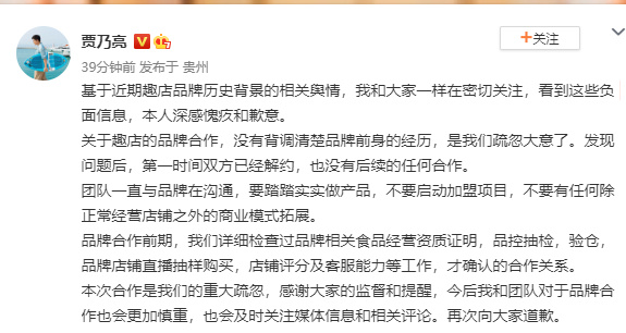 中新網(wǎng)7月26日電 7月26日下午,演員賈乃亮在微博發(fā)文道歉并表示,關(guān)于趣店的品牌合作,沒(méi)有背調(diào)清楚品牌前身的經(jīng)歷,是我們疏忽大意了。發(fā)現(xiàn)問(wèn)題后,第一時(shí)間雙方已經(jīng)解約,也沒(méi)有后續(xù)的任何合作。品牌合作前期,我們?cè)敿?xì)檢查過(guò)品牌相關(guān)食品經(jīng)營(yíng)資質(zhì)證明,品控抽檢,驗(yàn)倉(cāng),品牌店鋪直播抽樣購(gòu)買,店鋪評(píng)分及客服能力等工作,才確認(rèn)的合作關(guān)系。本次合作是我們的重大疏忽。(中新財(cái)經(jīng))