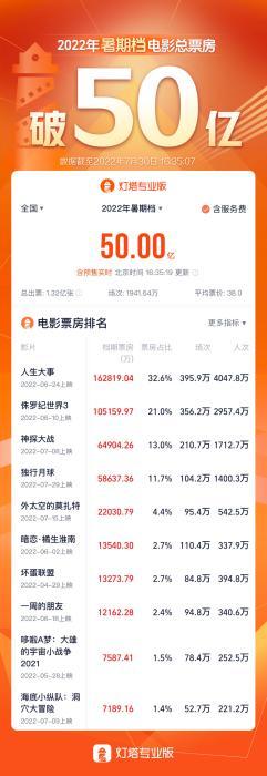 中新文娛北京7月30日電 據燈塔專業版,截至7月30日16時35分,2022暑期檔(6月1日-8月31日)總票房50.00億元(含預售),總場次1941.64萬,總人次1.32億。