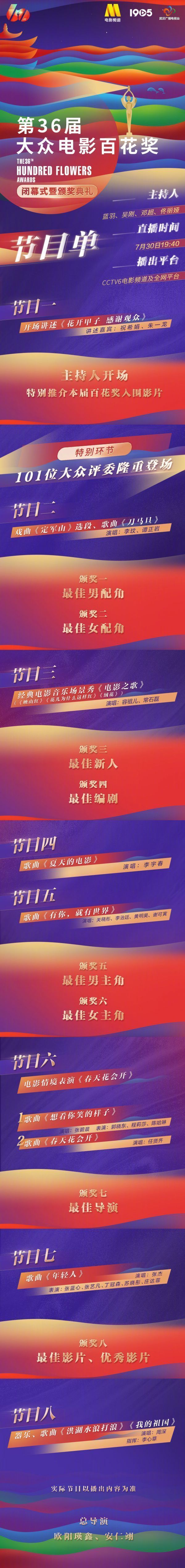 今晚的頒獎(jiǎng)禮晚會(huì)除了頒發(fā)“最佳影片獎(jiǎng)”“最佳導(dǎo)演獎(jiǎng)”“最佳編劇獎(jiǎng)”“最佳男主角”“最佳女主角”“最佳男配角”“最佳女配角”“最佳新人”8個(gè)獎(jiǎng)項(xiàng)外,還將獻(xiàn)上多個(gè)文藝節(jié)目。