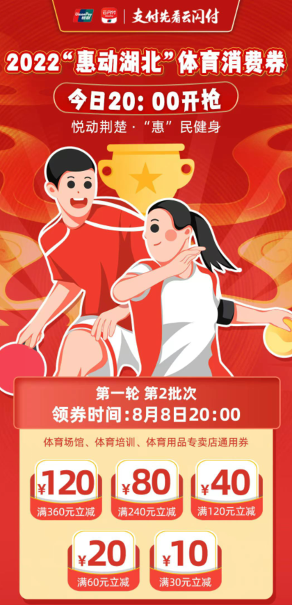 今晚8點,第一輪第二批次“惠動湖北”體育消費券又將來襲,與首批消費券相比,第二批消費券面值比例和投放次數均有所調整。第一輪第二批體育消費券將于8月8日至8月22日每天20時投放一次,共投放15次,前一日未被領取的消費券實行滾動投放,市民打開手機定位后,可在云閃付上搶領所在市州區域的消費券。據悉,第二批次120元、80元、40元面值的消費券數量均有所增加,將會帶來更大的實惠。