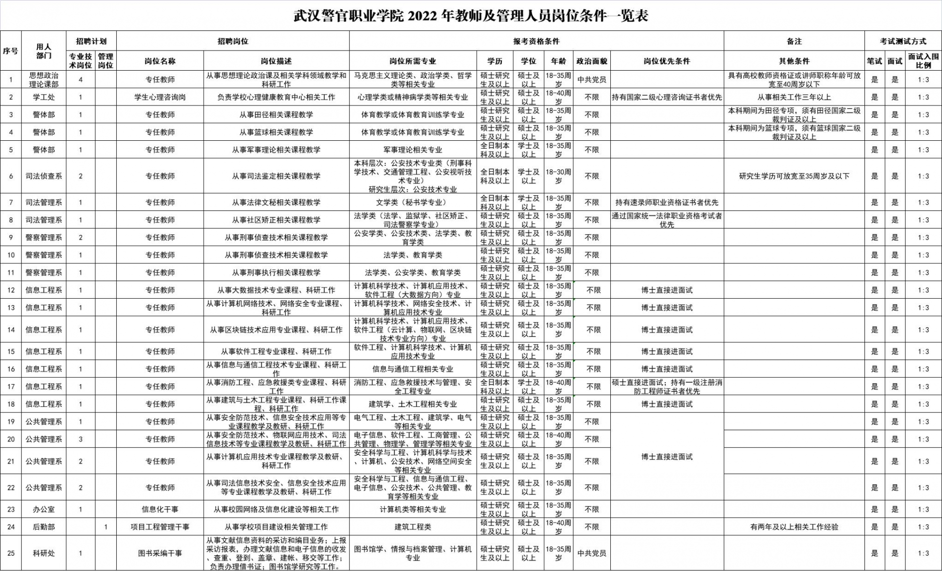 招聘對象應(yīng)符合應(yīng)聘崗位條件和要求,本次招聘武漢警官職業(yè)學(xué)院教師及管理人員34名,詳見《武漢警官職業(yè)學(xué)院 2022 年教師及管理人員崗位條件一覽表》(見附件)。