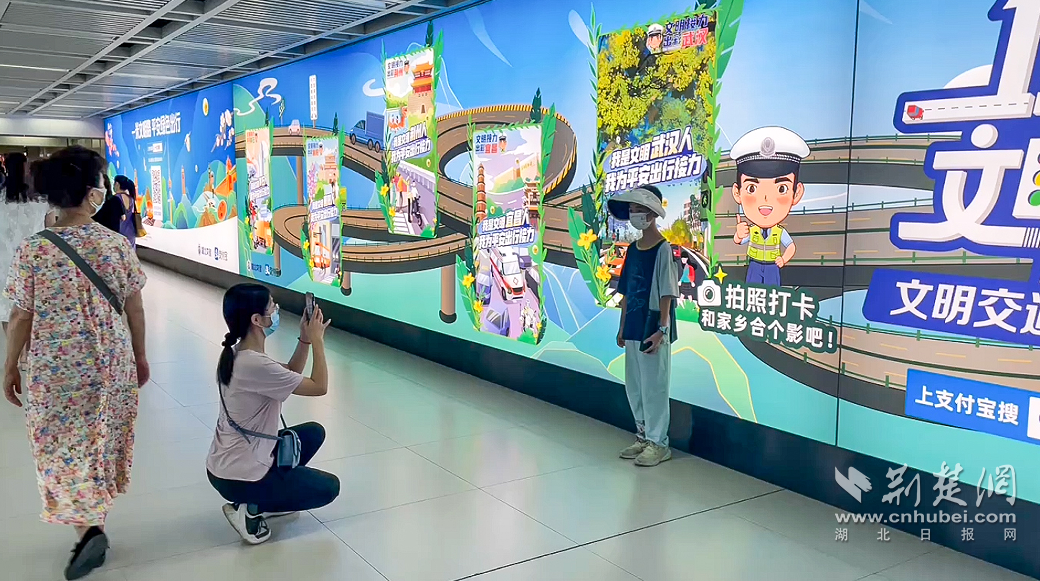 交通環境是城市文明的窗口,離不開每一位參與者的創造和守護。在武漢市中山公園地鐵站A通道設置有“一米文明路”交通安全主題展,長長的走廊兩側描繪著湖北17座城市的秀麗山水和安全出行、文明禮讓的街景,路過的行人紛紛駐足觀看,舉起手機和展畫上自己的家鄉拍照合影。通過活潑生動、形式多樣、群眾喜聞樂見的方式,湖北交警持續向廣大交通參與者普及交通安全知識,傳遞文明出行理念。