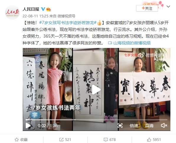 【驚艷!7歲女孩寫書法字跡矯若游龍】安徽宣城的7歲女孩許麗媛從5歲開始跟著外公練書法,現(xiàn)在寫的書法字跡矯若游龍,行云流水。其外公介紹,外孫女很努力,365天一天不落的練書法,這是她給自己定的練習規(guī)矩。現(xiàn)在已經(jīng)會4種字體了,她的書法贏得了很多網(wǎng)友的稱贊。