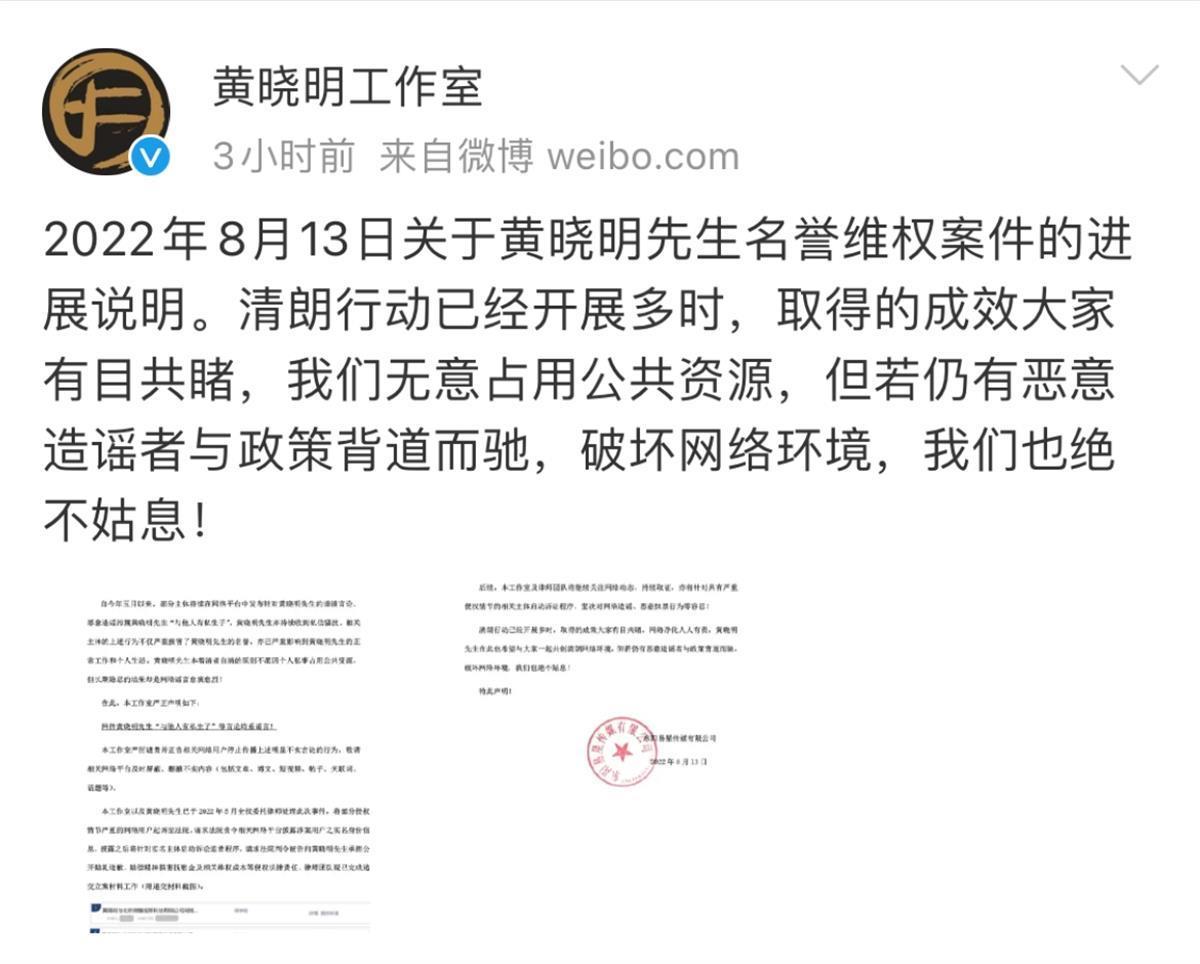 黃曉明工作室表示,清朗行動(dòng)已經(jīng)開(kāi)展多時(shí),取得的成效有目共睹,“我們無(wú)意占用公共資源,但若仍有惡意造謠者與政策背道而馳,破壞網(wǎng)絡(luò)環(huán)境,我們也絕不姑息! ”