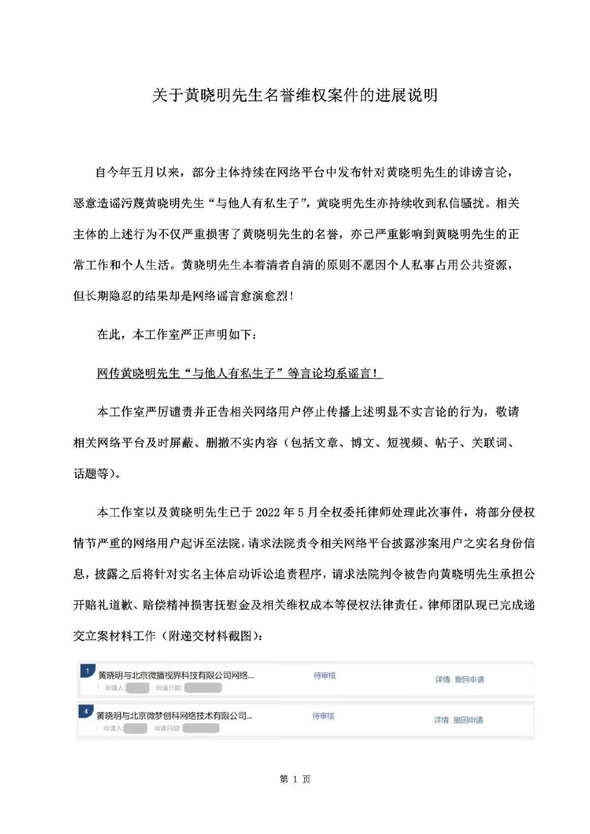 黃曉明工作室在聲明中表示,自2022年5月以來(lái),網(wǎng)絡(luò)平臺(tái)上出現(xiàn)了針對(duì)黃曉明的誹謗言論,“惡意造謠污蔑黃曉明先生‘與他人有私生子’,黃曉明先生亦持續(xù)收到私信騷擾。相關(guān)主體的上述行為不僅嚴(yán)重?fù)p害了黃曉明先生的名譽(yù),亦已嚴(yán)重影響到黃曉明先生的正常工作和個(gè)人生活。”