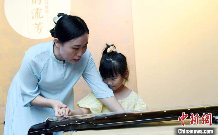 一名女童在老師指導下,現場體驗彈奏古琴。 記者劉可耕 攝