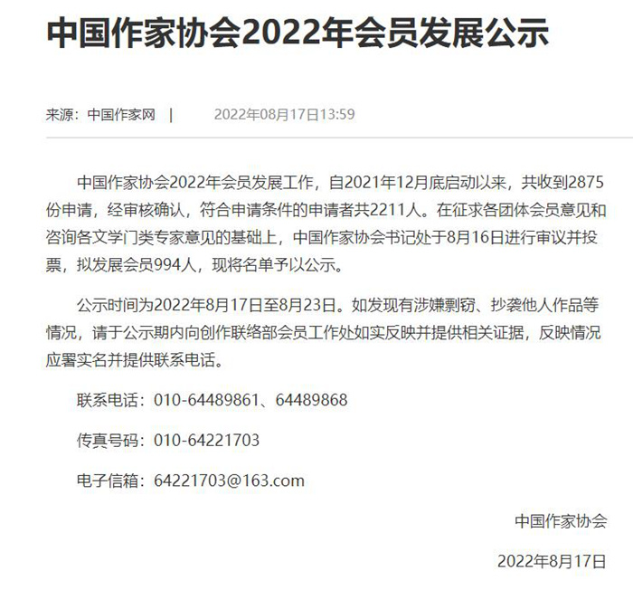 中國作家協會2022年會員發展公示。來源:網頁截圖。