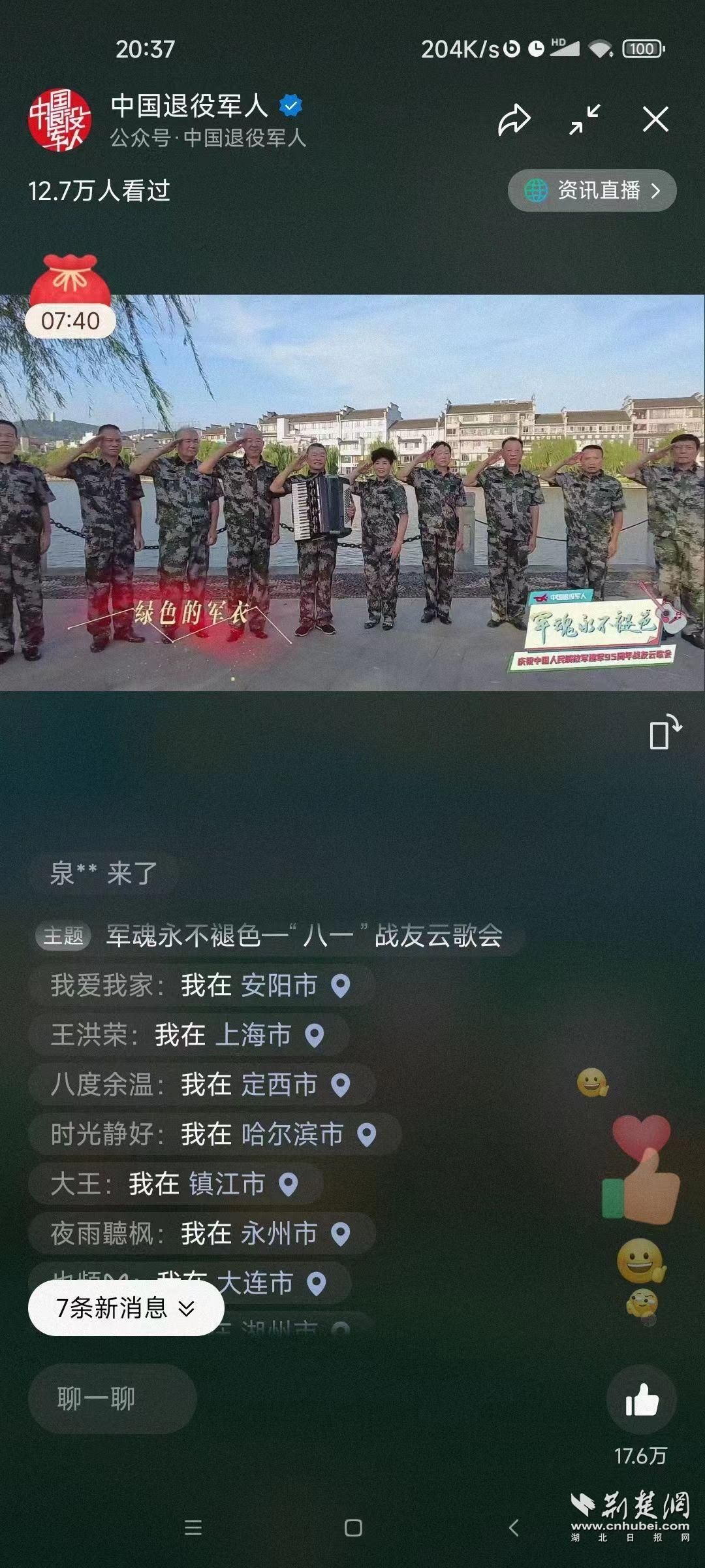 制作一部軍旅歌曲MV。組織退役老兵拍攝軍旅歌曲《綠色軍衣》,唱出對軍隊和軍營歲月的熱愛,演繹對軍人和軍人家屬的深情,該MV作為湖北省唯一作品參加退役軍人事務部“戰友云歌會”,超1200萬網友在線觀看。