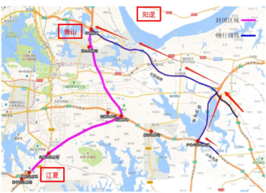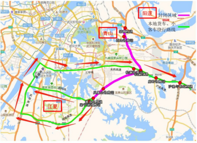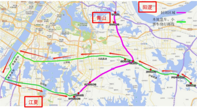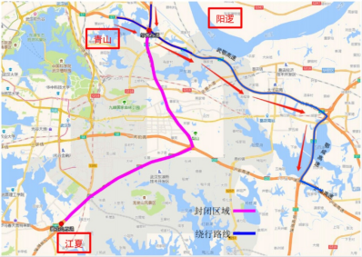 ②青山前往江夏方向:外埠貨車通過鄒黃互通→武鄂高速白滸山收費站掉頭→武漢四環線繞行;其他車輛通過鄒黃互通→武鄂高速→武漢三環線→武金堤路→武深高速→武漢四環線繞行。