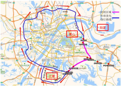 ②江夏前往黃石方向:外埠貨車通過武漢四環線→鄒黃互通→武鄂高速繞行;其他車輛通過武漢四環線→武深高速→武金堤路→武漢三環線→關豹高速→滬渝高速繞行。