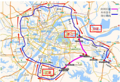 ①江夏前往青山方向:外埠貨車通過藏龍島互通→武漢四環線→鄒黃互通;其他車輛通過藏龍島互通→武漢四環線→武深高速→武金堤路→武漢三環線→武鄂高速→鄒黃互通繞行。