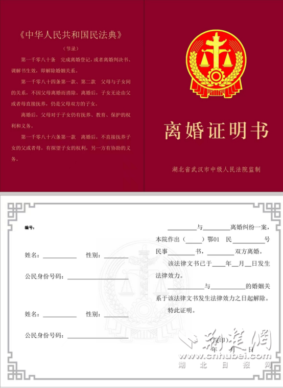 2020年8月,在武漢中院的指導(dǎo)下,洪山區(qū)人民法院發(fā)出全市首份《離婚證明書》,證明僅記載雙方當(dāng)事人身份信息、生效文書案號及婚姻關(guān)系解除狀況,獲當(dāng)事人一致好評。