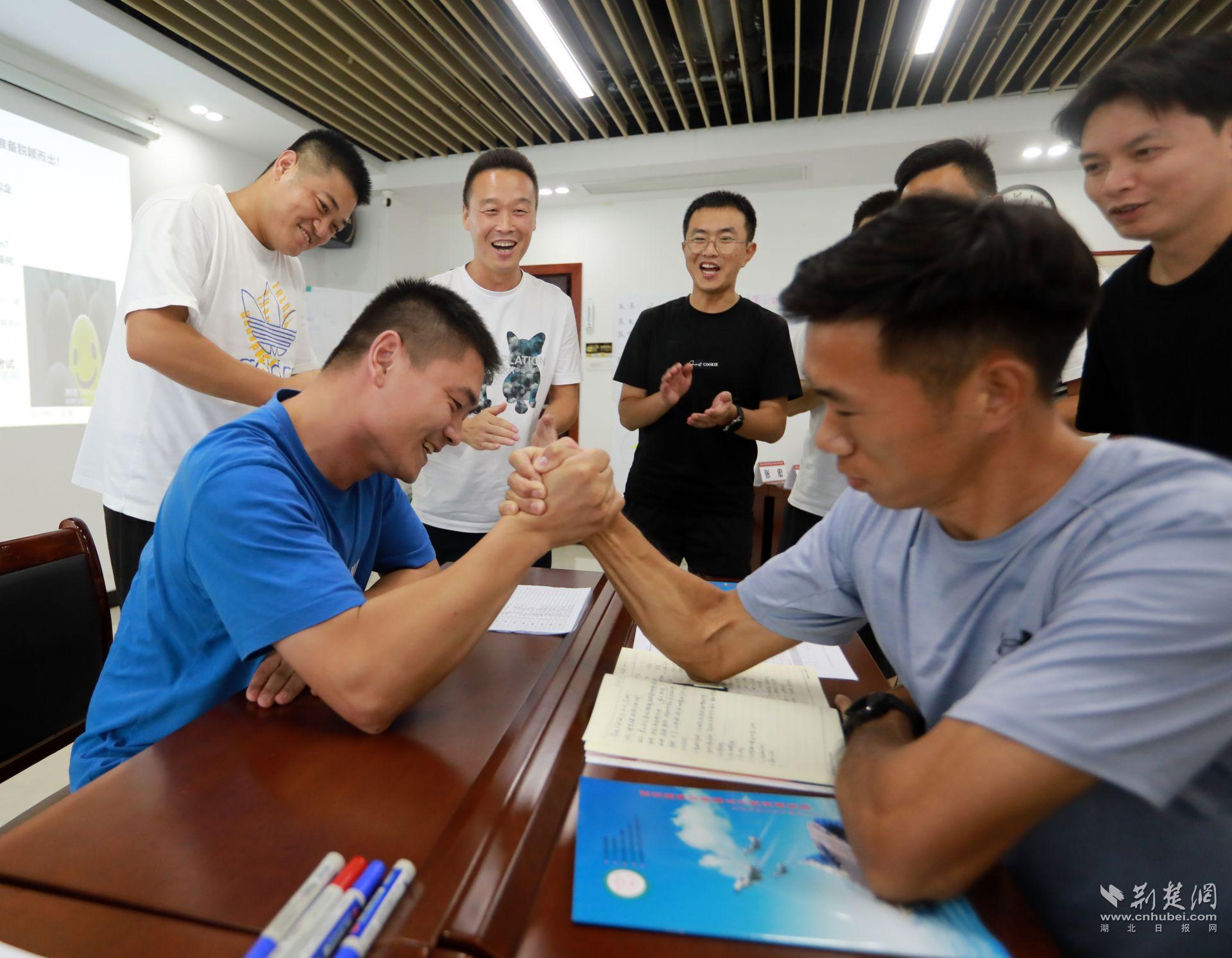 在湖北省華龍職業培訓學校新老退役士兵正在進行腕力較量。通訊員供圖